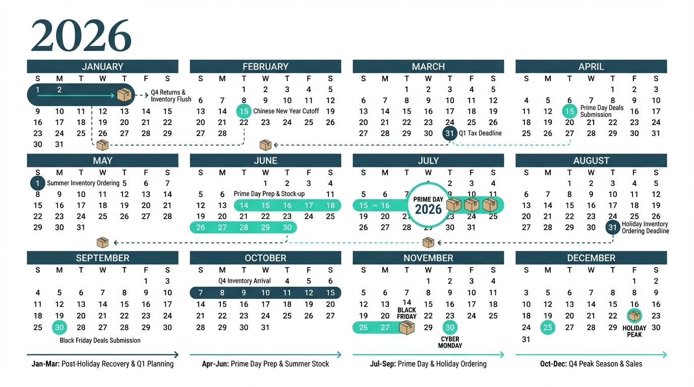 This 2026 Amazon seller calendar breaks down the events that matter, the inventory windows that sellers should watch, and the practical timing guidance that works across different shipment types and supplier origins.